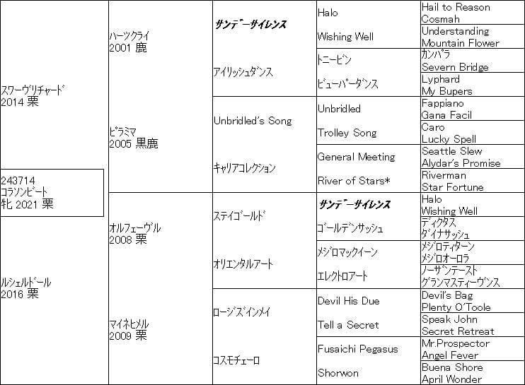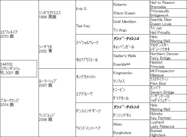 ヴァルコスやロカの姪でドゥラドーレスやアーバンシックのイトコ。母ブルークランズはJRA3勝(芝1800~2000)。牝祖ウインドインハーヘアはディープインパクトの母で子孫が繁栄中の名繁殖。父エピファネイアはJCと菊に勝ちエフフォーリアやデアリングタクトなどを出して成功。エピファネイア×ルーラーシップ×ダンスインザダークの血統どおりの長手の体型の中距離馬。赤松賞のようなペース(前後半48秒-46秒)ならばマイルでもやれる。(距離○スピード○底力◎コース◎)