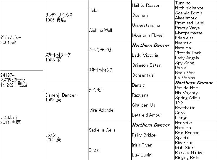 アスコリピチェーノの母アスコルティは芝1200~1400で2勝、しかし血統はDanehill Dancer×Sadler's Wells×Irish Riverですからなかなか重厚で、ダイワメジャー産駒で母系にSadler's Wellsとデインヒルが入るのはレシステンシアと同じ