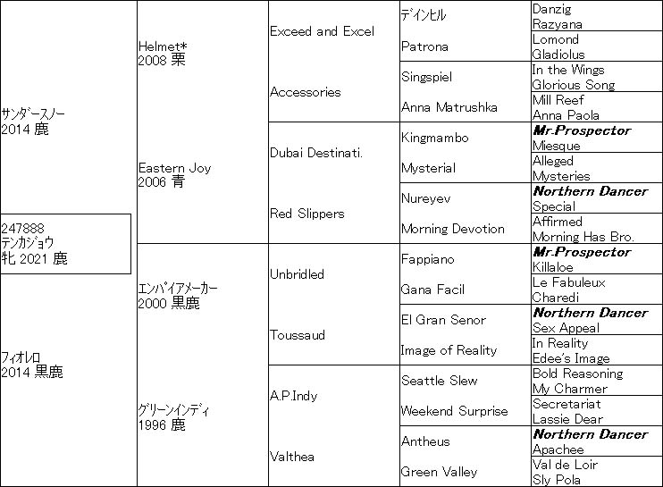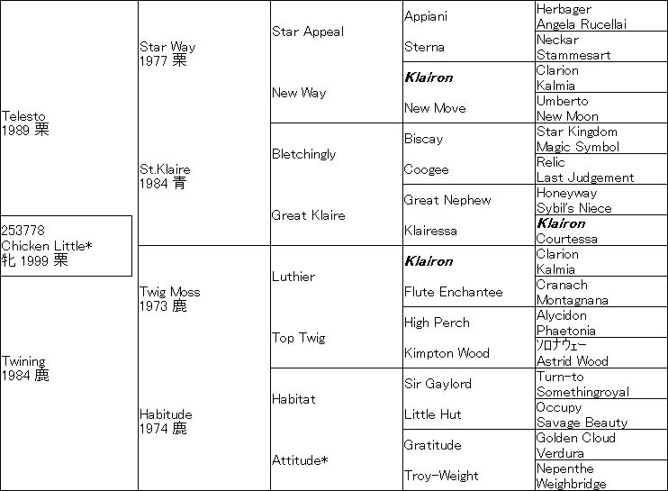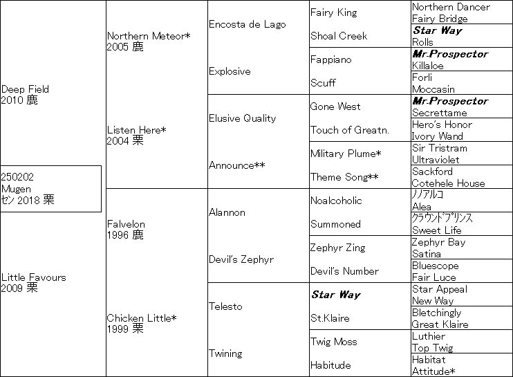 このChicken Littleをズバリ1/4異系としてそこにMr.Prospector4・5×4とSir Ivor≒Secrettame6×4・5・5のDeep Fieldを投入し、自身はStar Way5×4とKlairessa≒Luthierのニアリークロス7×5・6