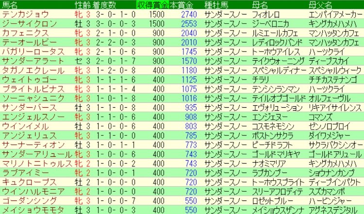 マリーンCはテンカジョウが猛烈前傾ラップを追い込み、サンダースノー産駒の重賞初制覇となりましたが、このサンダースノー産駒は以下のようにとにかく牝が走る