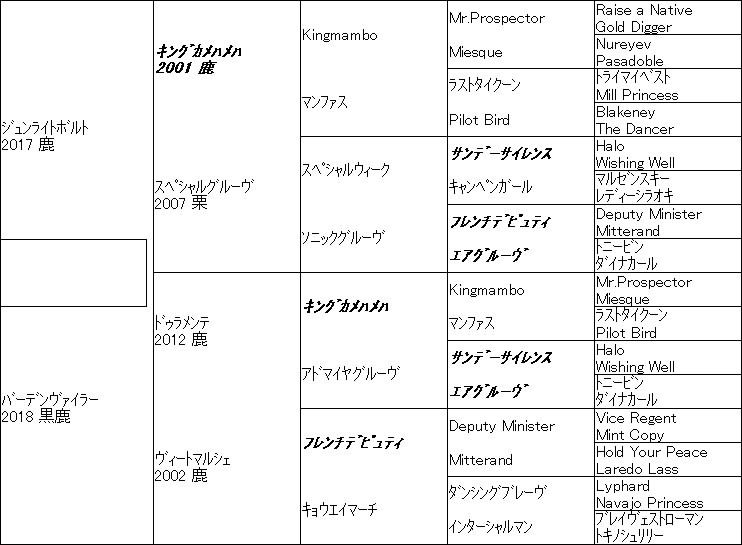 フレンチデピュティとノーザンテーストが出会うと互いの北米パワー血脈が脈絡してダートに振れやすいことは、たとえばオルフェーヴル×フレンチデピュティでマルシュロレーヌ、ヘリオス、アルドーレが出ていることで実感できますが、マルシュロレーヌの弟バーデンヴァイラーは父がドゥラメンテなので、血脈構成はジュンライトボルトとかなり重なるんですよね