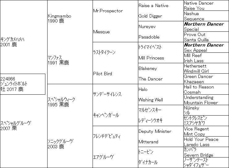 このソニックグルーヴの枝はフレンチデピュティとノーザンテーストのパワーの要素が強く他の枝とは趣を異にしていて、フレンチデピュティの立ち繋ぎが語られるときにはいつもソニックグルーヴの地面に突き刺さってるような立ち姿が取り上げられるぐらいで、そういうフレンチデピュティ的脚元を伝えるので、ジュンライトボルトがダートで覚醒したのはそのあたりだろうと